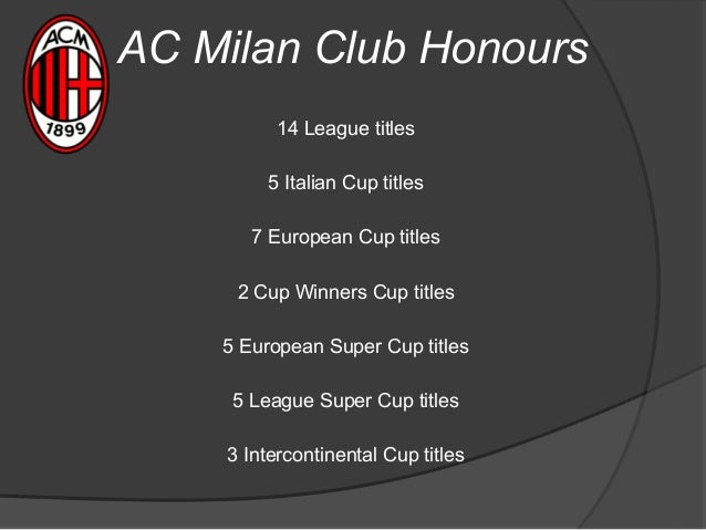 With seven European CupsChampions Leagues two European Cup Winners Cups five European Super Cups and five Intercontinental CupsFIFA Club World Cups they have been Italian footballs greatest representatives. In their 121. 2x FIFA Club World Cup winner.